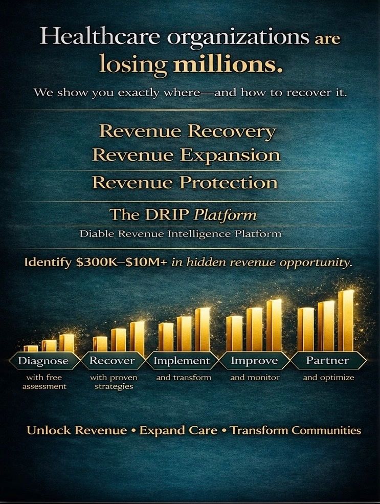 DRIP™ (Diable Revenue Intelligence Platform™) uncovers missed revenue, exposes underperformance, & identifies optimization pathways across healthcare organizations.
